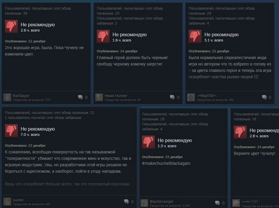 Получив ряд запросов от игроков в течение минувшего года, мы решили сменить цвета героя, сделав его оранжевым вместо черного. Мы признаём, что вследствие различий культурного кода и особенностей истории Центральной Европы и прочих регионов мы не приняли во внимание, что Чучел, оживший комочек пыли, может вызвать ассоциации с блэкфейсом — театральным гримом с расистским уклоном, популярным в Соединенных Штатах в XIX веке. Мы от всей души приносим свои извинения тем, кого оскорбила внешность предыдущего варианта Чучела. Будучи мирными креативными людьми, мы не хотим, чтобы наши игры и их персонажи вызывали даже самые отдаленные ассоциации с расизмом или другими вариантами нетерпимости. Во избежание дальнейших недоразумений мы загрузили обновленный облик Чучела в Steam, а в ближайшее время изменим его и в версиях для прочих платформ. Благодарим за понимание и поддержку, — сообщает Amanita Design.