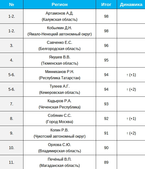 Не сдали позиций и губернатор Белгородской области Евгений Савченко и Тюменской области Владимир Якушев, вновь расположившись на третьем и четвертом местах. Глава Чечни Рамзан Кадыров продолжает занимать седьмое место рейтинга: