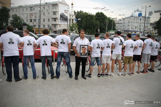Не успели сочувствующие Ходорковскому забыть об инциденте, как за их спинами, за территорией, огороженной под проведения митинга, возникла цепочка из молодых людей. На их футболках был изображен Владимир Петухов с подписью: «Вы плачете по идолам. А кто прольет слезы о тех, кого убили?».