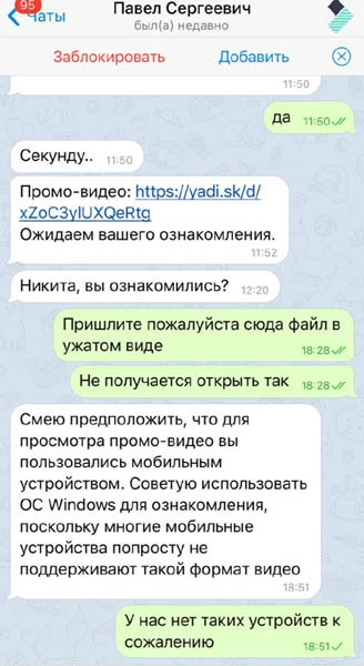 По словам атакованных владельцев Telegram-каналов, мошенники во всех случаях использовали примерно одинаковую схему. Они хотели «купить рекламное место» и предлагали посмотреть видеоролик со своими материалами, которые следовало разместить на ресурсе.
