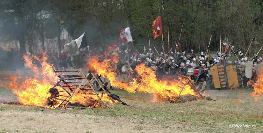 Самое интересное начинается в 16 часов, зрительным залом служит большой холм, на нём усаживаются зрители, а внизу возле леса «сцена», где и проходит сама битва. Зрелище, конечно, незабываемое. Но, как говориться, лучше один раз увидеть, чем сто раз услышать, поэтому я сделала небольшое видео, сама битва длилась около часа, а всё мероприятие целый день.