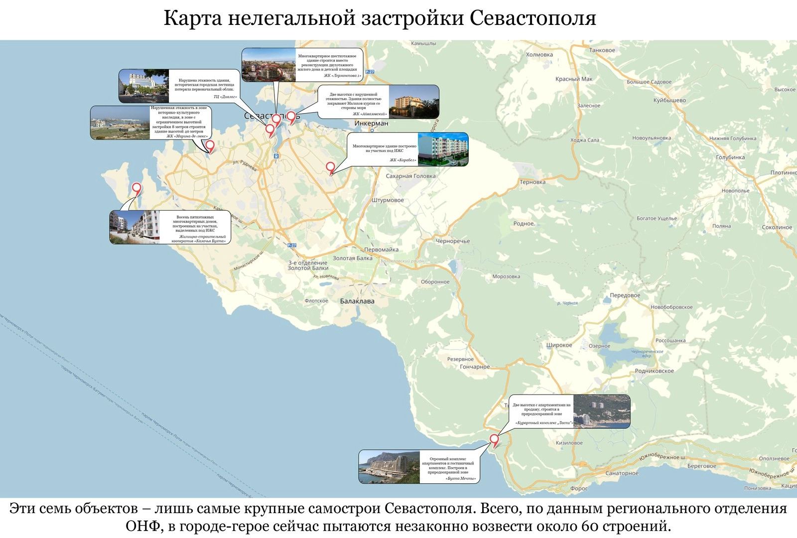 По данным активиста регионального отделения ОНФ Ивана Комелова, в Севастополе насчитывается более 60 незаконных крупных построек. Пытаясь обойти законодательство, некоторые из них мимикрируют под санаторно-курортные комплексы.
