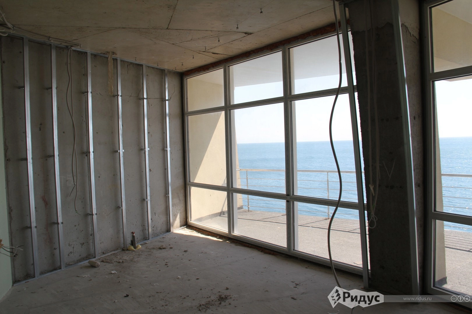 В лабиринте коридоров нам наконец демонстрируют будущую квартиру. Кругом — голый бетон, лишь подведены коммуникации да окна установлены. В них, к слову, наблюдается любопытная картина: прямо на пляже начинается ещё одна стройка.