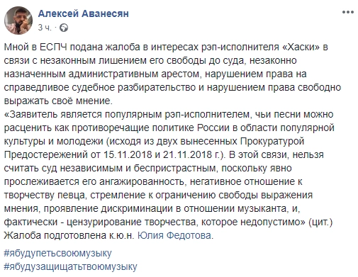 Мной подана жалоба в ЕСПЧ в интересах рэп-исполнителя Хаски в связи с незаконным лишением его свободы до суда, незаконно назначенным административным арестом, нарушением права на справедливое судебное разбирательство и нарушением права свободно выражать свое мнение, — написал юрист на своей странице в Facebook.