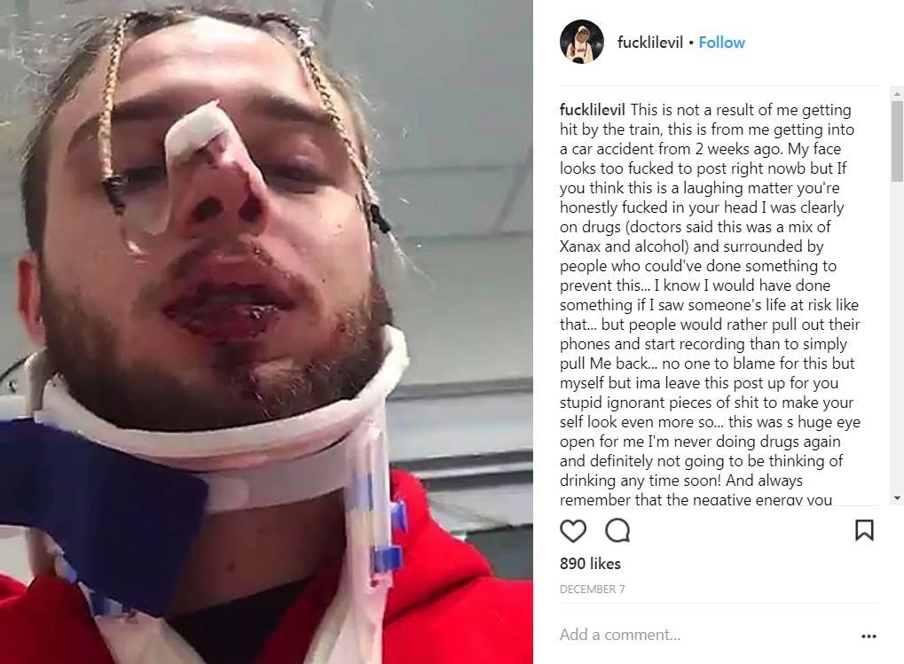 В комментарии к снимку молодой человек признал, что в момент происшествия находился в неадекватном состоянии: «Врачи сказали, что к этому привело сочетание "Ксанакса" [психотропный препарат, — прим. "Ридус"] и алкоголя», но упрекнул окружающих, что никто из них не оттащил его от края платформы, а вместо этого просто наблюдал и снимал происходящее на смартфон.