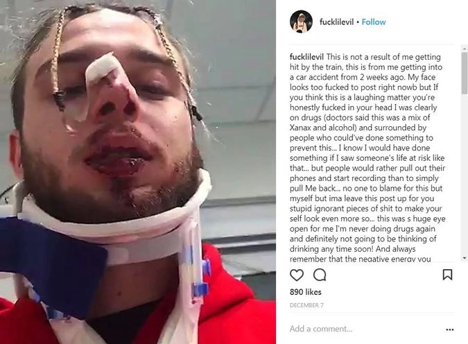Пока состав не подошел к платформе, один из пассажиров достал смартфон и начал снимать чудачества музыканта, и затем в кадр попал и момент столкновения. К счастью, поезд уже тормозил, так что Lil Evil хотя и получил сильный удар по голове, но остался жить.