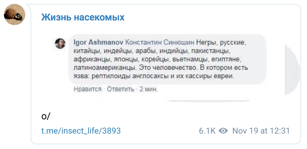 Фейсбучники — они такие: они видят дискуссию, которая происходит у некоего нациста и власовца, который объясняет о «хрусте французской булки», о том, что русские должны создать национальное государство, что русских людей обижают и так далее. Я рассказал ему про рептилоидов — и фейсбучники с очень умными лицами тут же принимаются за фигурную резьбу по цитатам: вырезают кусок, который их поразил, даже не понимая, о чем вообще речь.