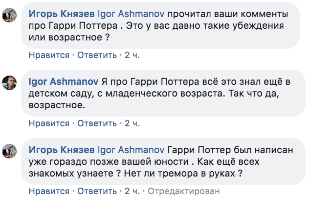 В анонимных Телеграм-каналах обсуждают фрагменты диалога IT-предпринимателя в Фейсбуке, в котором Ашманов объясняет устройство современного мира на примере книг о Гарри Поттере.