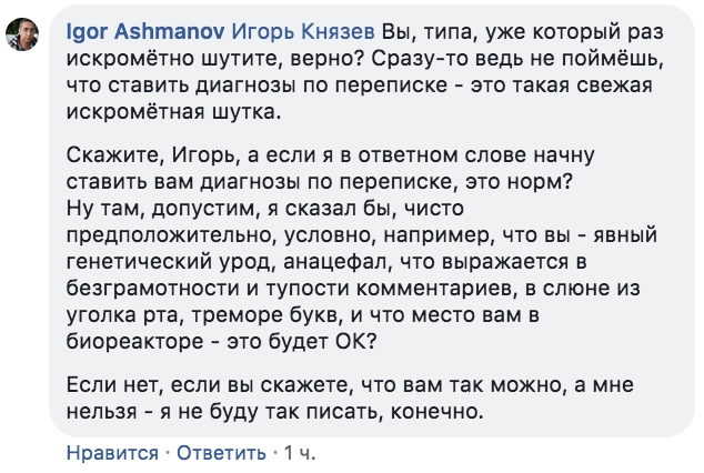 Вот тот самый комментарий Ашманова в дискуссии с предпринимателем Константином Синюшиным, который принялись подробно анализировать пользователи соцсетей: