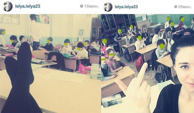 Накануне в соцсети попала фотография 18-летней студентки педагогического колледжа по имени Олеся. Девушка во время прохождения педагогической практики в обычной ульяновской школе сделала «селфи» на фоне детей с закинутыми на стол ногами и неприличным жестом, а потом выложила всё это в свой Instagram, сообщают местные СМИ