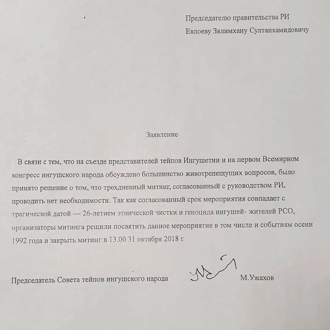 Уличные протесты против соглашения Рамзана Кадырова и Юнус-Бека Евкурова о новых границах между Ингушетией и Чечней завершены. В правительство Республики Ингушетия поступило заявление от председателя РОД «Совет тейпов ингушского народа — Мехк кхел» Малсага Ужахова о прекращении митинга.