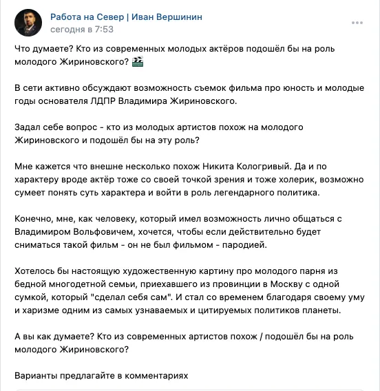 Депутат тюменской областной думы от партии ЛДПР Иван Вершинин считает, что Владимира Жириновского в грядущем фильме о создателе либерал-демократической партии мог бы сыграть Никита Кологривый, получивший широкую известность после исполнения роли Кащея из сериала «Слово пацана: кровь на асфальте». По его мнению, Никита похож на Владимира Вольфовича и внешне, и по темпераменту.