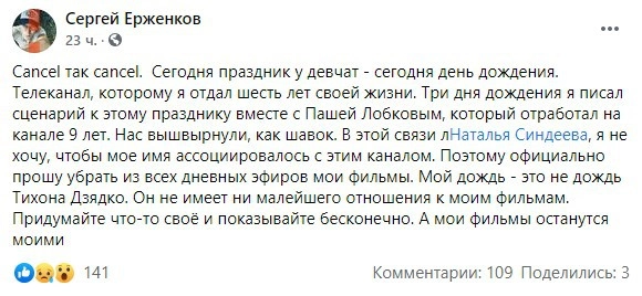 Режиссер телеканала «Дождь» и документальных проектов Ксении Собчак Сергей Ерженков выступил в Facebook с требованием к руководству канала убрать все его фильмы из сетки вещания. Он приурочил свой пост ко «дню дождения» СМИ.
