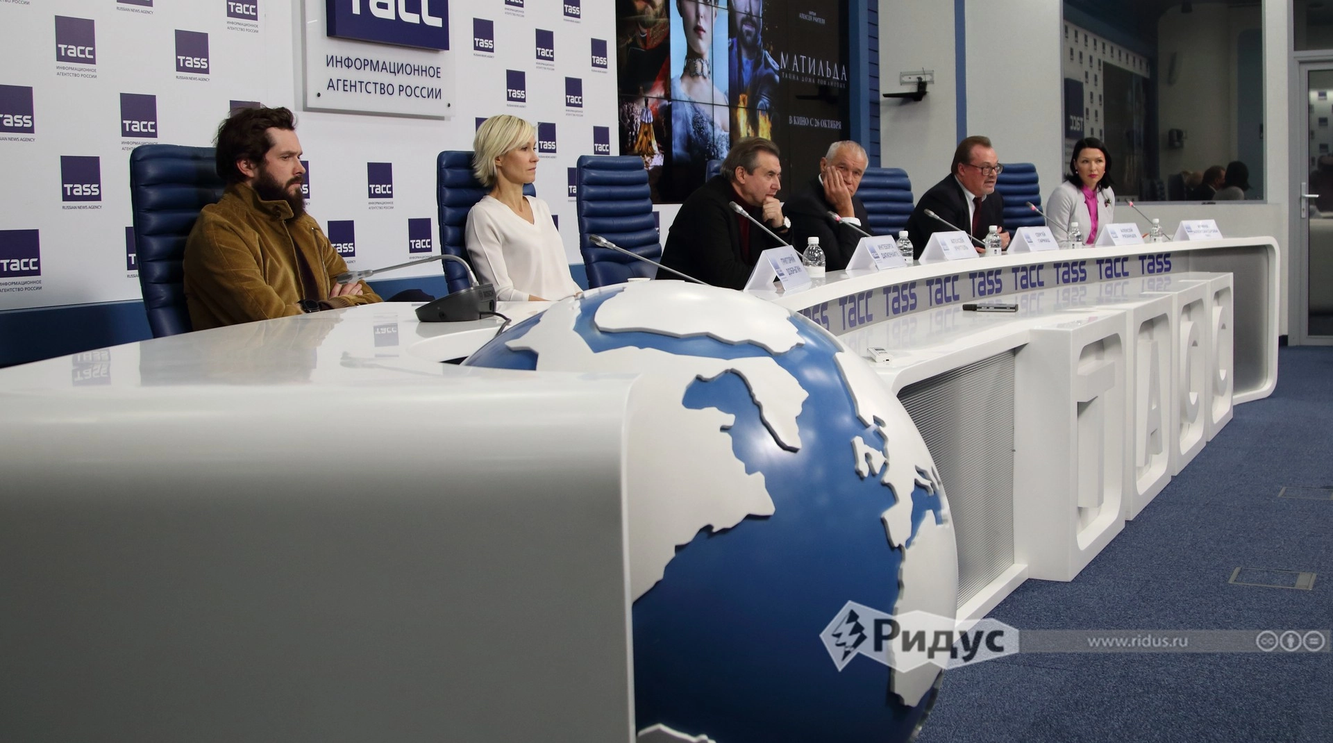 Григорий Добрыгин, Ингеборга Дапкунайте, Алексей Учитель, Сергей Гармаш и генеральный директор «Каропрокат» Алексей Рязанцев на московской пресс-конференции по фильму «Матильда»