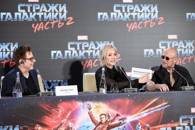 Режиссёр Джеймс Ганн, актриса Пом Клементьефф и актёр Майкл Рукер на московской пресс-конференции по фильму «Стражи Галактики. Часть 2»