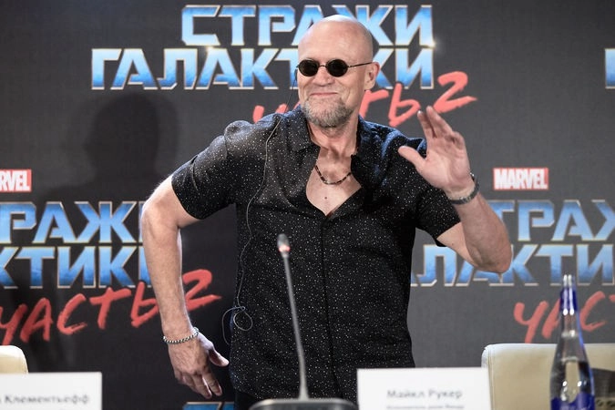 Актёр Майкл Рукер, актриса Пом Клементьефф и режиссёр фильма «Стражи Галактики. Часть 2» Джеймс Ганн на фотоколле в Москве