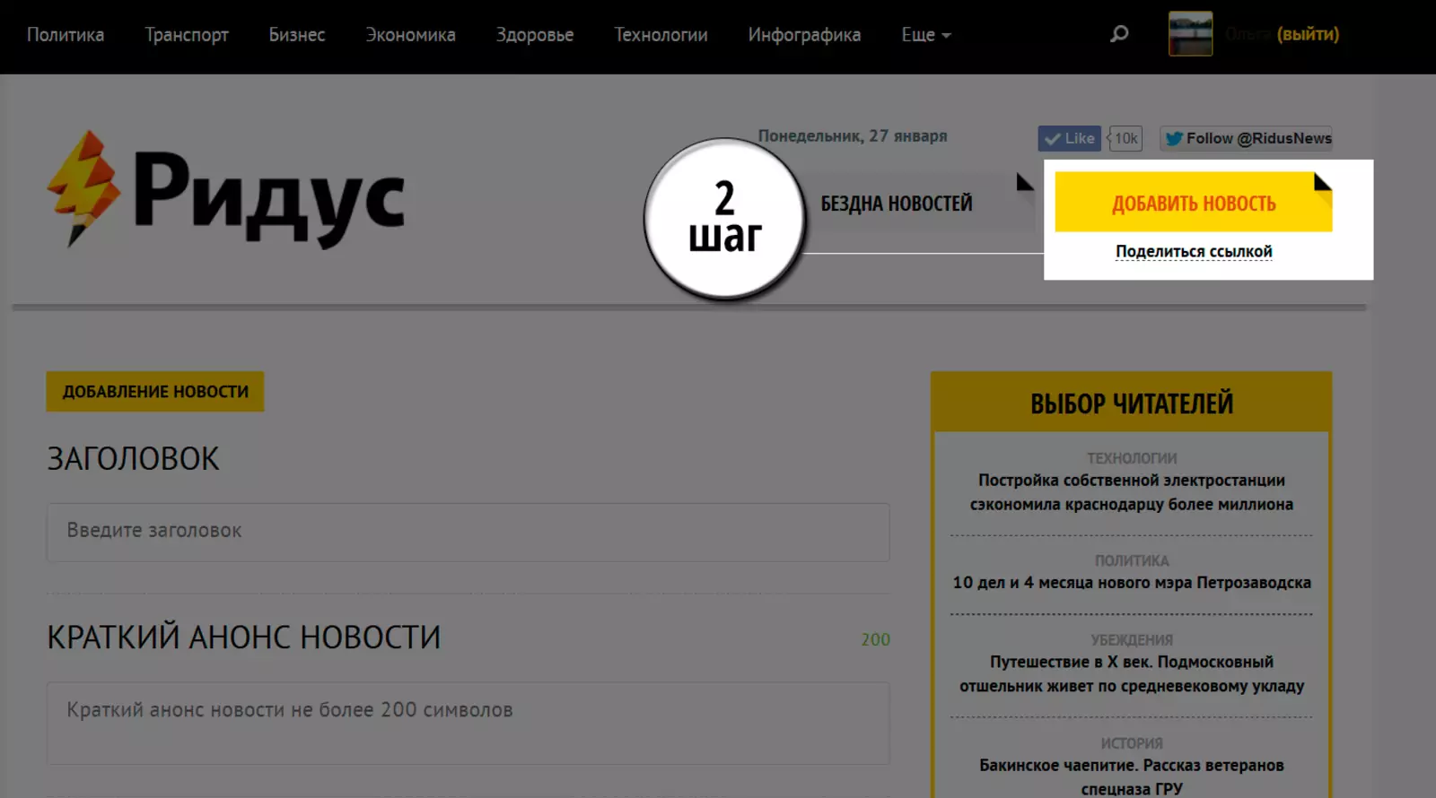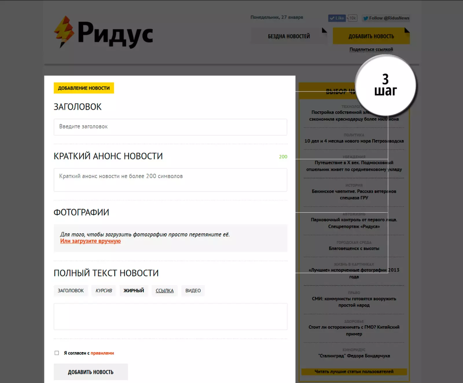 Опубликовать новость на «Ридусе» ничуть не сложнее, чем пост в LiveJournal, Wordpress или на любой другой блоговой платформе. Для этого необходимо выполнить пять простых шагов.