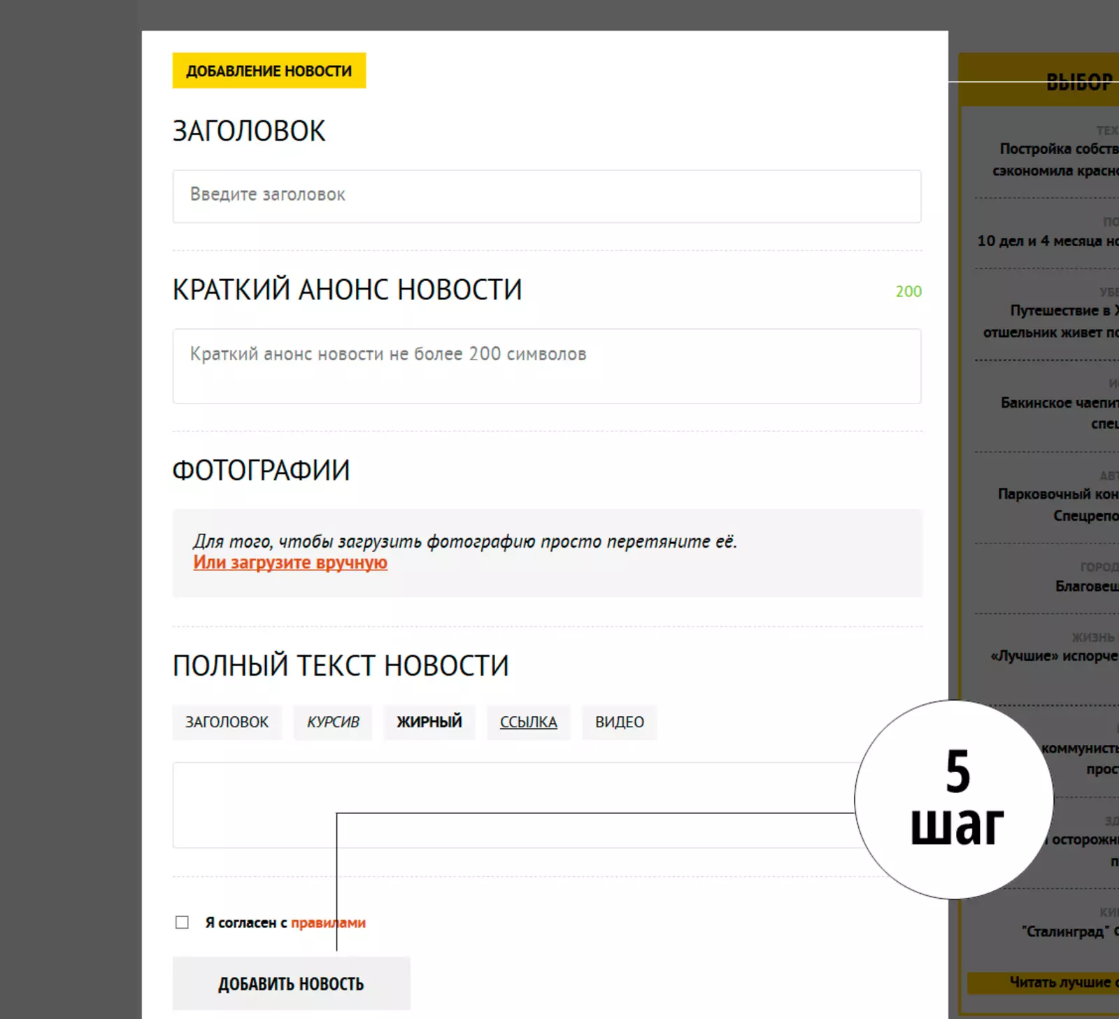 Шаг 5. После завершения работы над текстом и вставки фото (см. ниже) нажмите на кнопку «Добавить новость», находящуюся в левом нижнем углу страницы