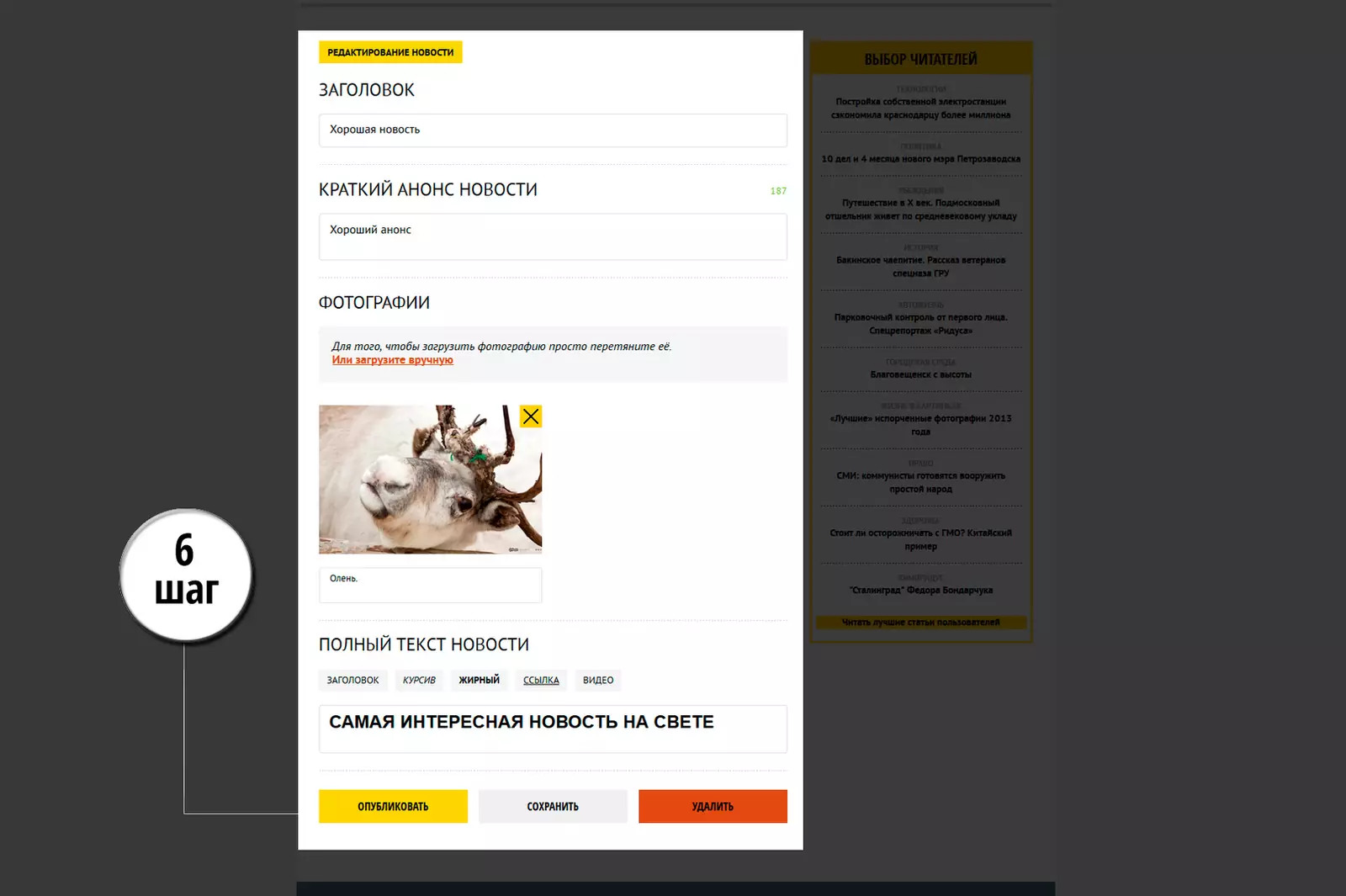 Шаг 6. Теперь вы оказываетесь на новой странице, ваша новость попала в черновики, после этого нажмите на кнопку «Опубликовать новость», и ваша новость появится в модерации сайта. Можно, правда, с начала, не спешить с публикацией — если время терпит, нажать на кнопку «Сохранить новость» и она будет еще открыта для вашей правки. Но учтите, пока не нажали на кнопку «Опубликовать новость», никто ее, в том числе и редакторы не увидят. Зато после того, как вы нажмете на кнопку «Опубликовать новость», она будет доступна только редакторам и модераторам.