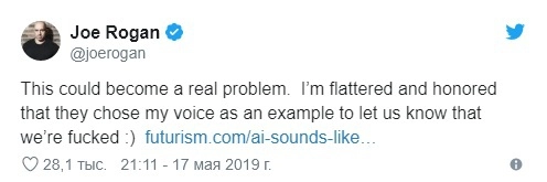 Команда программистов Dessa Engineers создала нейронную сеть, которая полностью скопировала голос известного американского комика и ведущего Джо Рогана. Сходство оказалось настолько точным, что испугало не только простых пользователей, но и саму знаменитость.