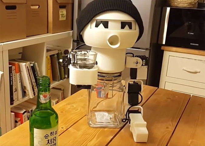 Робот очень похоже имитирует движения человека, «требуя налить горячительного», и «охотно» его «выпивает». После того как содержимое стопки оказывается сначала во «рту» устройства, а затем — в банке под ним, у робота на щеках загорается электронный румянец.