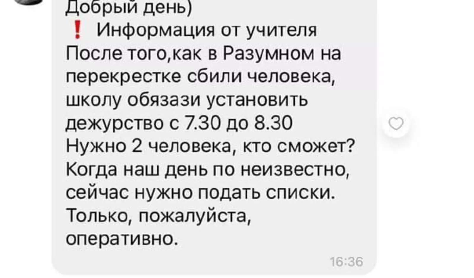 По словам одной из родительниц, сообщение об этом распространяют в школьном чате. Там утверждается, что «школу обязали» предоставить списки родителей, которые будут осуществлять дежурство.