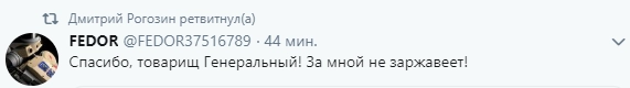 Сам Федор поблагодарил Рогозина за клип: «Спасибо, товарищ Генеральный! За мной не заржавеет!»