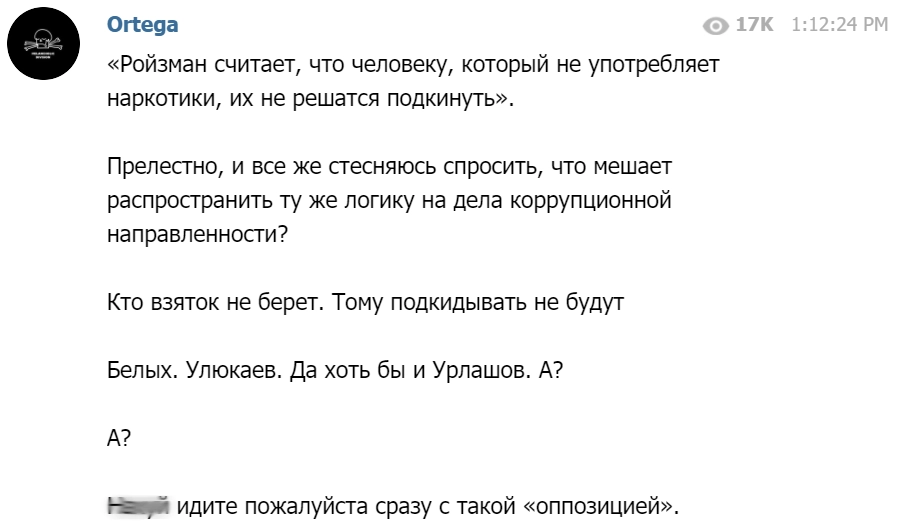 Ройзман: Илья, я вам сейчас попытаюсь объяснить. Во-первых, как показывает практика ― а я практик, и у меня за плечами огромное количество операций против наркоторговцев, ― практически невозможно подбросить наркотики человеку, который их не употребляет или с ними никак не связан, потому что это становится очевидным сразу и для всех.
