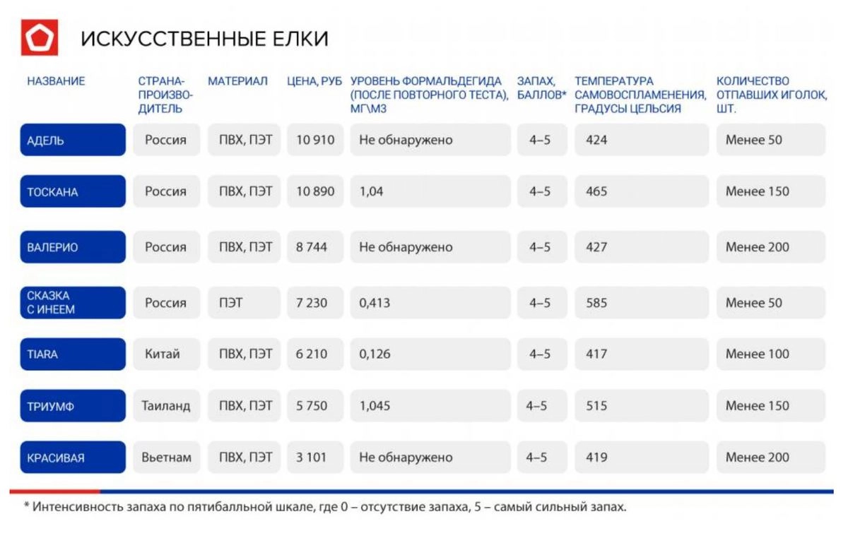 Согласно гигиеническим нормативам, предельно допустимая концентрация формальдегида в воздухе не должна превышать 0,05 мг/м3. Таким образом, худшие образцы пластиковых елей выделяли почти 30 максимально допустимых доз ядовитого газа. При этом от цены безопасность пластиковой ели не зависела.