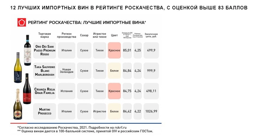 Специалисты Роскачества проверили исследование 126 импортных вин стоимостью до 1100 рублей, представленных на прилавках отечественных магазинов и составили рейтинг 12 самых качественных напитков. Из итогового документа следует, что самое большое количество баллов набрали образцы из Испании.