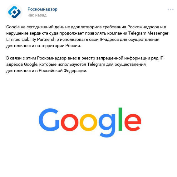 Роскомнадзор заблокировал ряд IP-адресов поисковой системы Google из-за того, что их используют для подключения к мессенджеру Telegram, говорится в сообщении ведомства в соцсети «ВКонтакте».