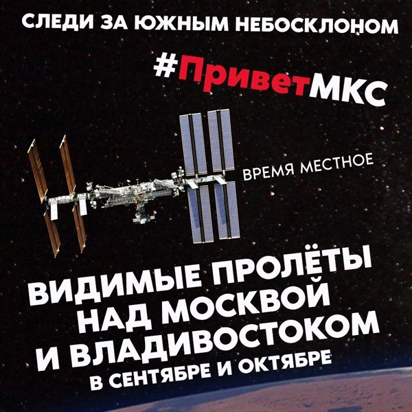 С 20 сентября по 10 октября нынешнего года жители России смогут увидеть в ночном небе Международную космическую станцию (МКС). «Роскосмос» призвал соотечественников передать привет и помахать рукой экипажу.