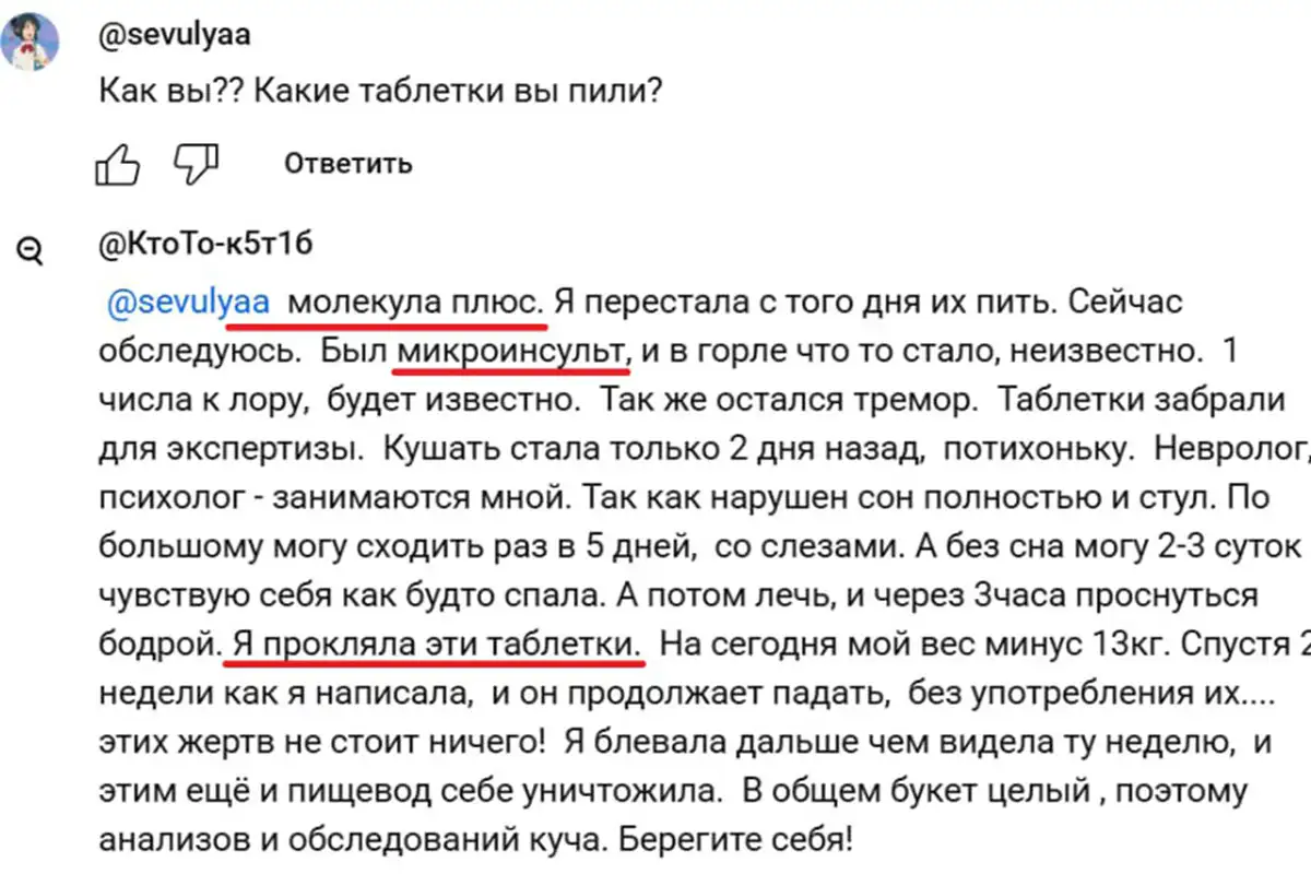 В социальных сетях достаточно много хвалебных комментариев о данном препарате. Однако в последнее время стали появляться и отрицательные отзывы. Так, одну девушку «Молекула плюс» едва не довела до инсульта.