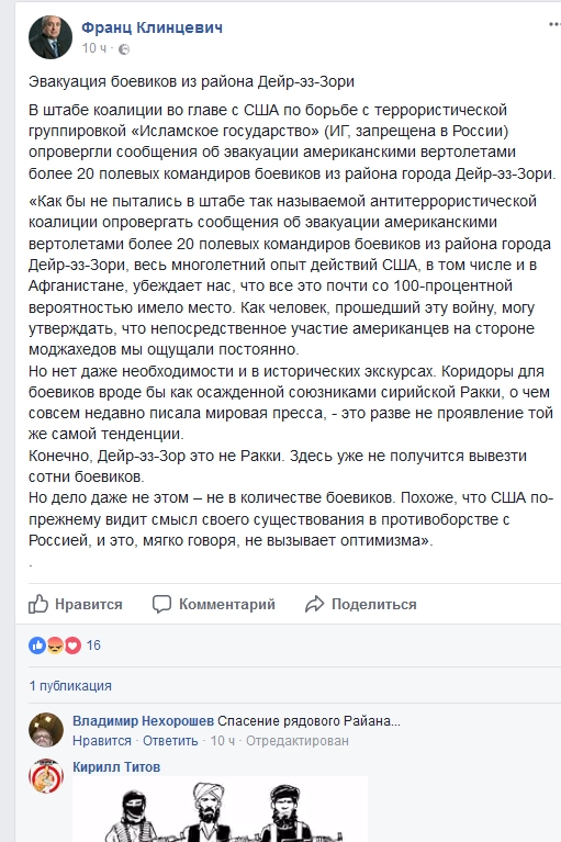 В то же время первый зампред комитета Совета Федерации по обороне и безопасности Франц Клинцевич считает, что США на вертолетах эвакуировали из Дейр-эз-Зора некоторых полевых командиров боевиков, о чем написал на своей странице в Facebook.