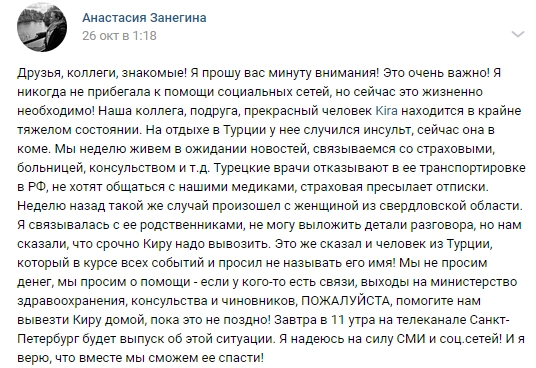 Подруга туристки рассказала о ее ситуации в социальной сети «ВКонтакте».