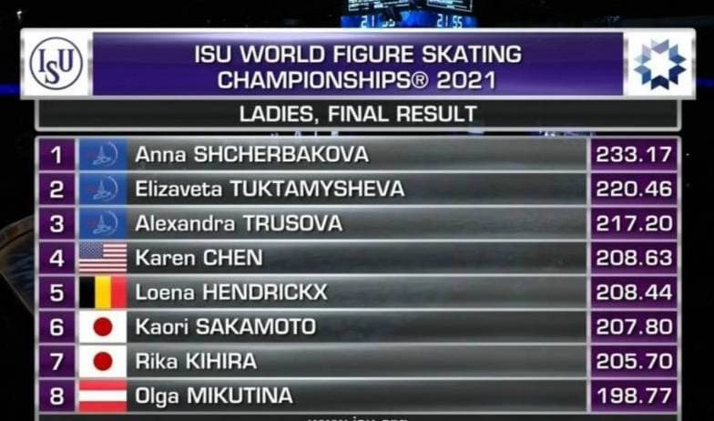 В женском одиночном катании на чемпионате мира в Стокгольме впервые в истории весь пьедестал почета заняли российские фигуристки. Чемпионка мира — Анна Щербакова, серебряный призер — Елизавета Туктамышева, бронзовый призер — Александра Трусова.