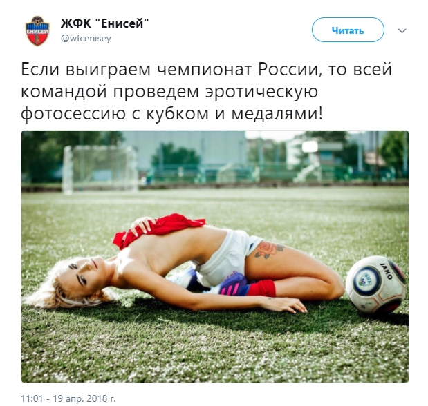 Футболистки «Енисея» пообещали принять участие в эротической фотосессии в случае победы их команды в чемпионате России. Об этом спортсменки сообщили в Twitter-аккаунте футбольного клуба.