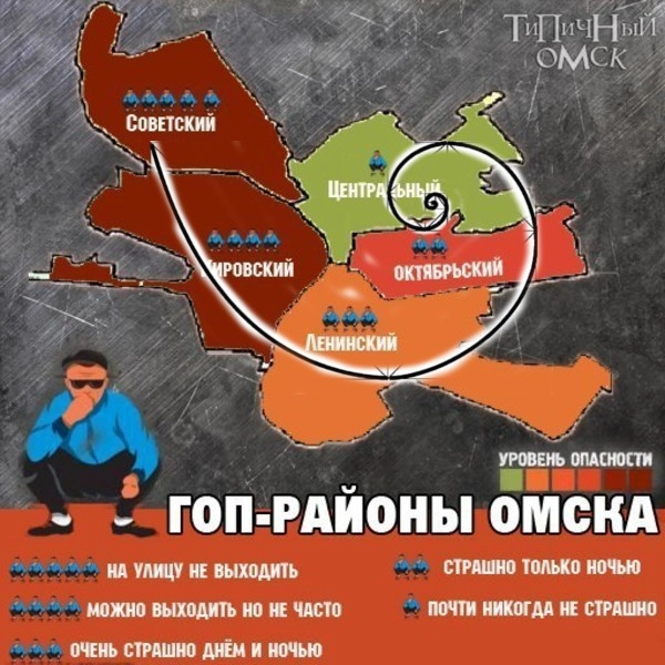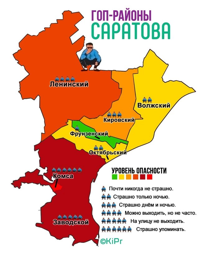Согласно «пособию», самый благополучный район — Фрунзенский, расположен в центре. Ему создатели карты поставили одного «гопника», а вот в Комсе (поселок Комсомольский) и Заводском лучше вообще не выходить на улицу.