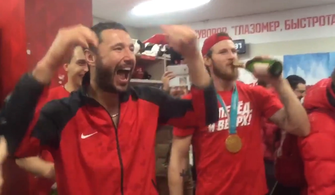 Российские хоккеисты отметили победу шампанским и матерной песней Шнурова