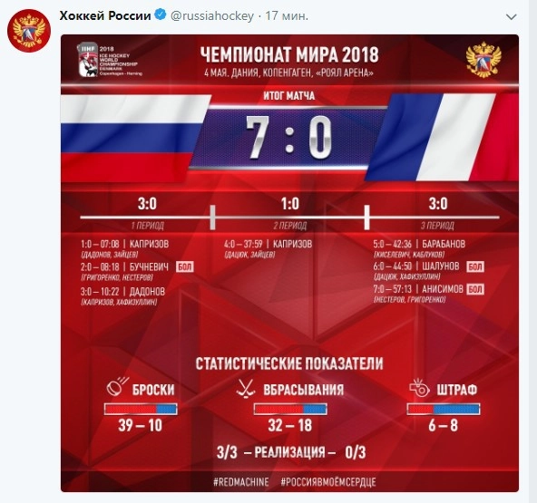 Три шайбы оказались в воротах французов еще до конца первого тайма. После перерыва еще одна шайба попала в ворота соперников.