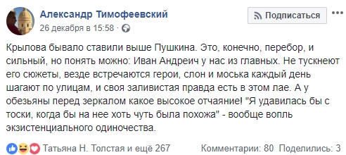 Так, кинокритик и журналист Александр Тимофеевский вспомнил о незабвенной крыловской моське, вечно лающей на маститого слона.