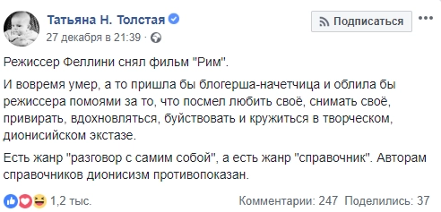 Известный писатель Татьяна Толстая ничтоже сумняшеся провела параллель между книгой Ипполитова и фильмом Федерико Феллини «Рим» и порадовалась за последнего, что того уже нет в живых, «а то пришла бы блогерша-начетчица и облила бы режиссера помоями за то, что посмел любить свое, снимать свое, привирать, вдохновляться, буйствовать и кружиться в творческом, дионисийском экстазе».
