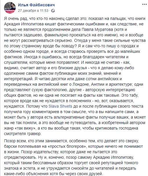 В то же время журналист Илья Файбисович «рад, что кто-то наконец показал на пальцах, что книги Аркадия Ипполитова кишат фактическими ошибками».