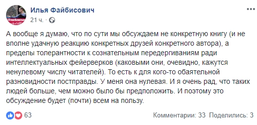 В другом своем посте Файбисович отметил, что возникшая благодаря рецензии, мягко выражаясь, дискуссия показала, «что по сути мы обсуждаем не конкретную книгу, а пределы толерантности к сознательным передергиваниям ради интеллектуальных фейерверков».