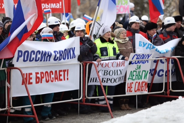 В кемеровском парке Победы имени Жукова митинг собрал работников угольных, химических предприятий, представителей общественных объединений и студентов. Его участники держали в руках плакаты «Шахтеры Кузбасса поддерживают жителей Крыма», «Мир народу Украины», «Крым с нами», «Россия своих не бросает» и другие. По данным пресс-службы обладминистрации, в акции приняли участие более 10 тысяч человек.