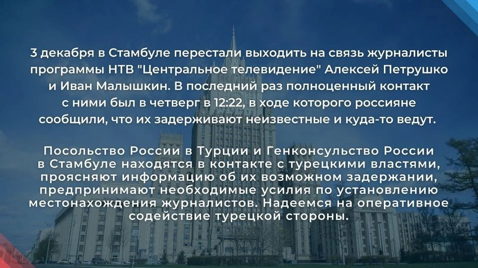 В свою очередь, МИД России сообщил в Facebook, что российское посольство в Анкаре и Генконсульство РФ в Стамбуле находятся в контакте с турецкими властями, проясняют информацию об их возможном задержании и предпринимают необходимые усилия по установлению местонахождения журналистов.