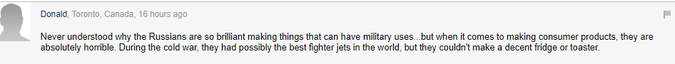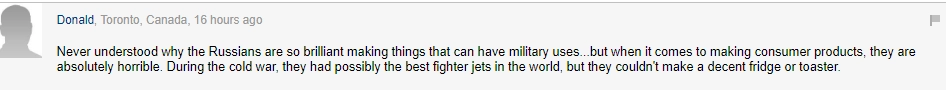 «Никогда не понимал, почему русские так хорошо делают то, что может иметь военное применение, и так плохо — товары массового потребления. В холодную войну они делали лучшие истребители в мире, но не могли произвести достойный тостер».