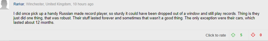 «Однажды я купил российский радиоприемник, он был такой прочный, что мог выпасть из окна и все равно работать исправно. То, что они производят, живет вечно, за одним лишь исключением — автомобили».