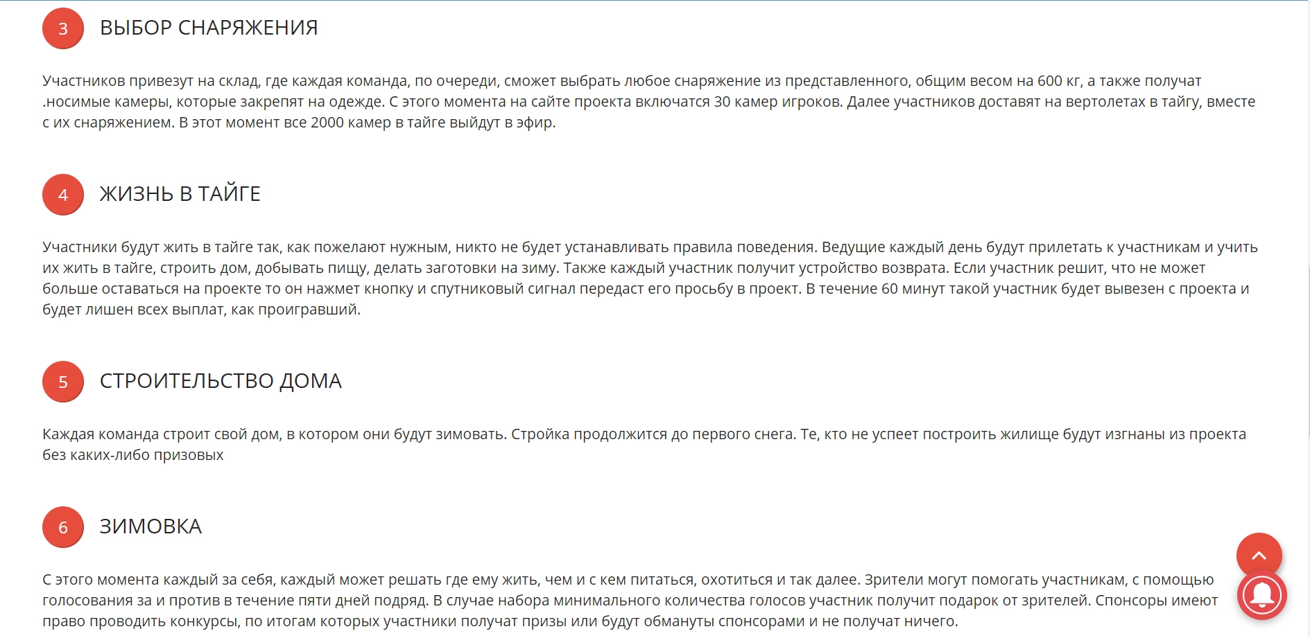 Участники шоу, утверждал Пятковский, проведут в сибирской тайге девять месяцев, занимаясь охотой и собирательством. Тому, кто выдержит испытание до конца, бизнесмен пообещал выплатить 100 миллионов рублей.