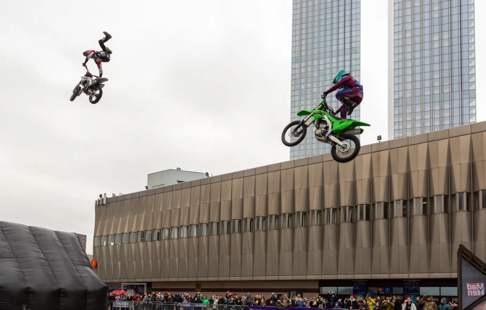 На все выходные уличная площадка «Экспоцентра» превратилась в экстрим-зону, где выступали лучшие мотоспортсмены. Экстремальный мотофристайл в исполнении «Шоу Безумцев» покорил всех любителей острых ощущений. А от опасных трюков 2-х кратного чемпиона России по стантрайдингу Никиты Присяжнюка захватывало дух!